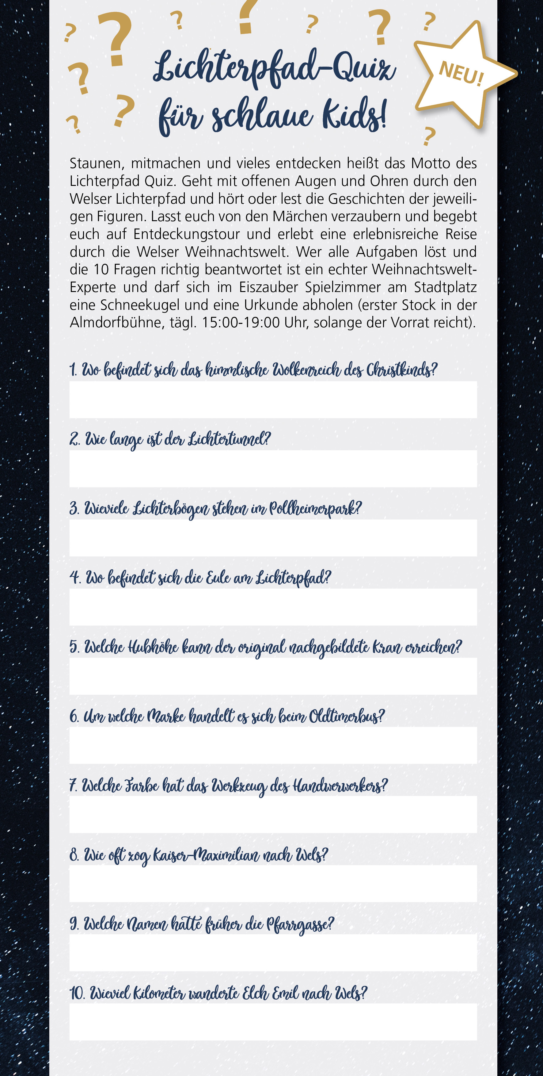 Staunen, mitmachen und vieles entdecken heißt das Motto des Lichterpfad Quiz. Geht mit offenen Augen und Ohren durch den Welser Lichterpfad und hört oder lest die Geschichten der jeweiligen Figuren. Lasst euch von den Märchen verzaubern und begebt euch auf Entdeckungstour und erlebt eine erlebnisreiche Reise durch die Welser Weihnachtswelt.