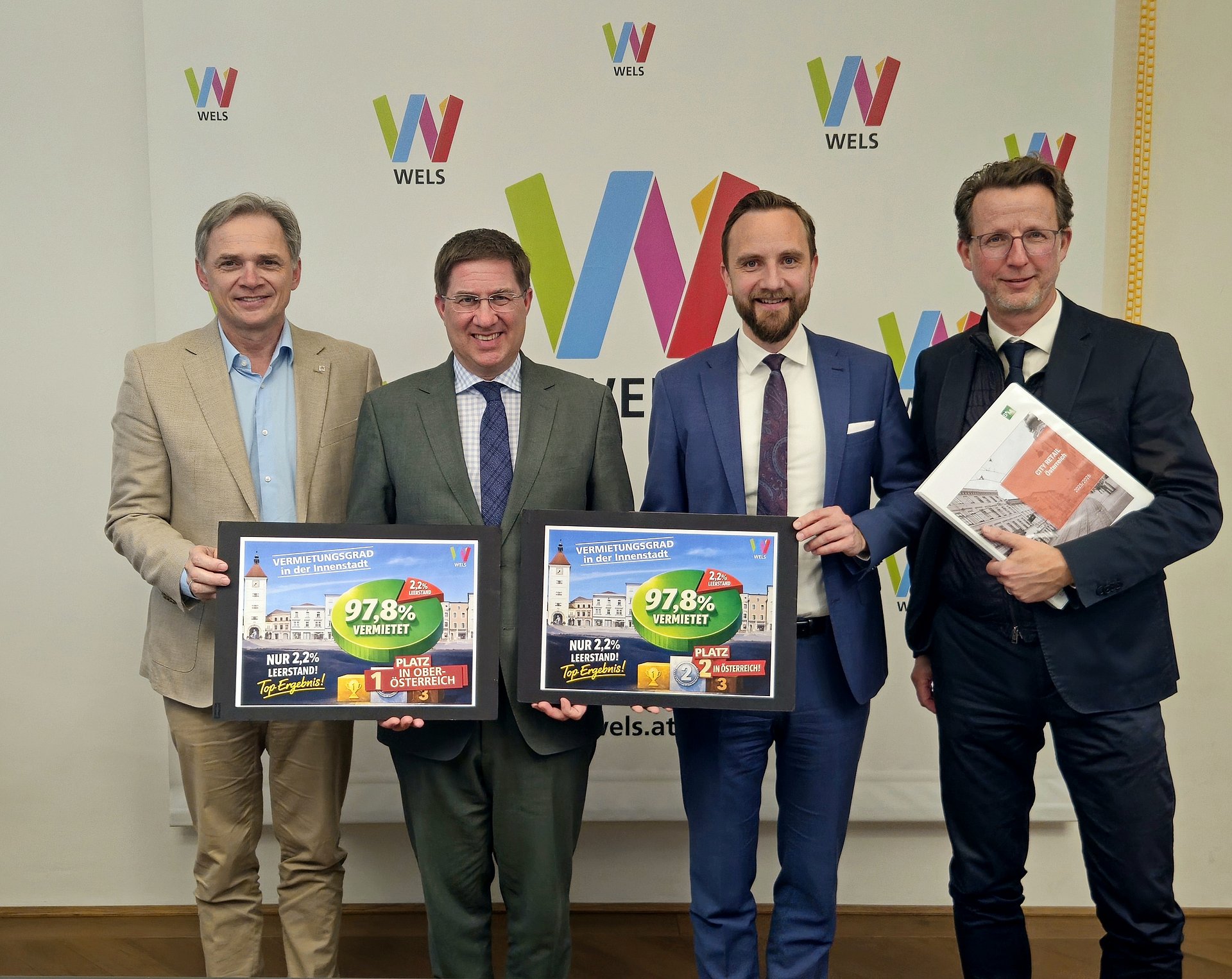 Foto v.l.n.r.: Peter Jungreithmair, MBA (GF Wels Marketing & Touristik GmbH/WBA), Bürgermeister Dr. Andreas Rabl (Stadt Wels), Wirtschaftsstadtrat Dr. Martin Oberndorfer (Stadt Wels), Mag. Hannes Lindner (Geschäftsführer von Standort + Markt)